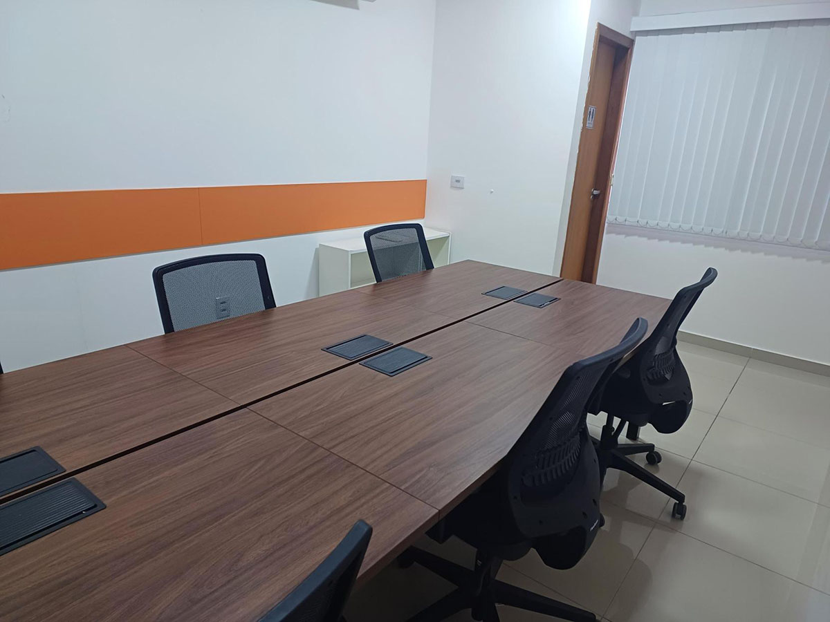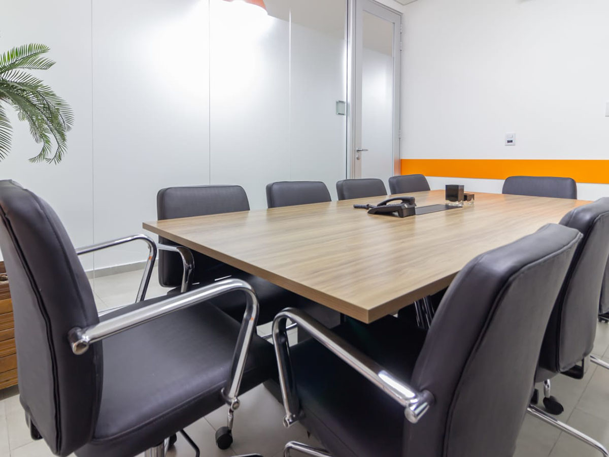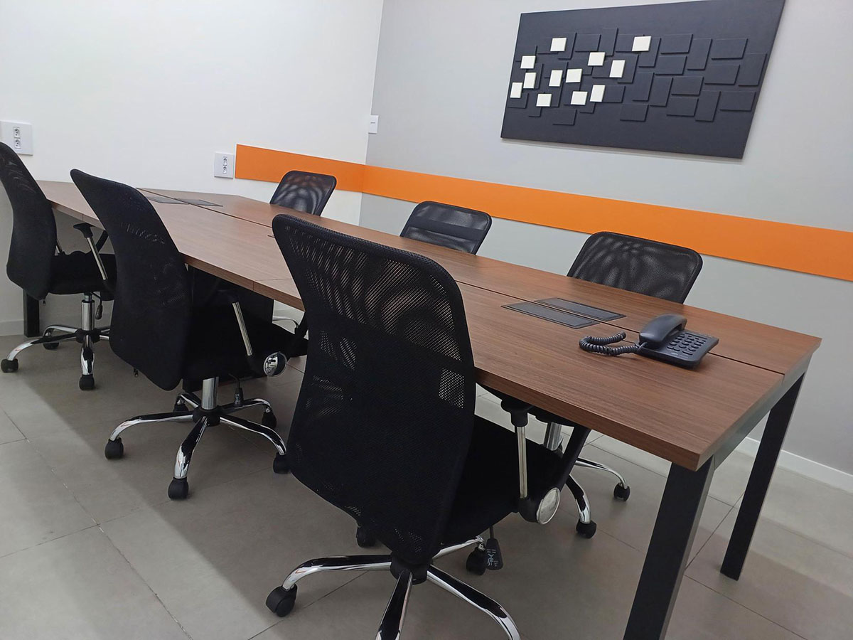- Mesa e cadeiras para até 10 pessoas - Monitor 50” (HDMI e MS Wireless) - Lousa de vidro - Internet wi-fi (Ubiquiti) - Café expresso e água - Ar-condicionado