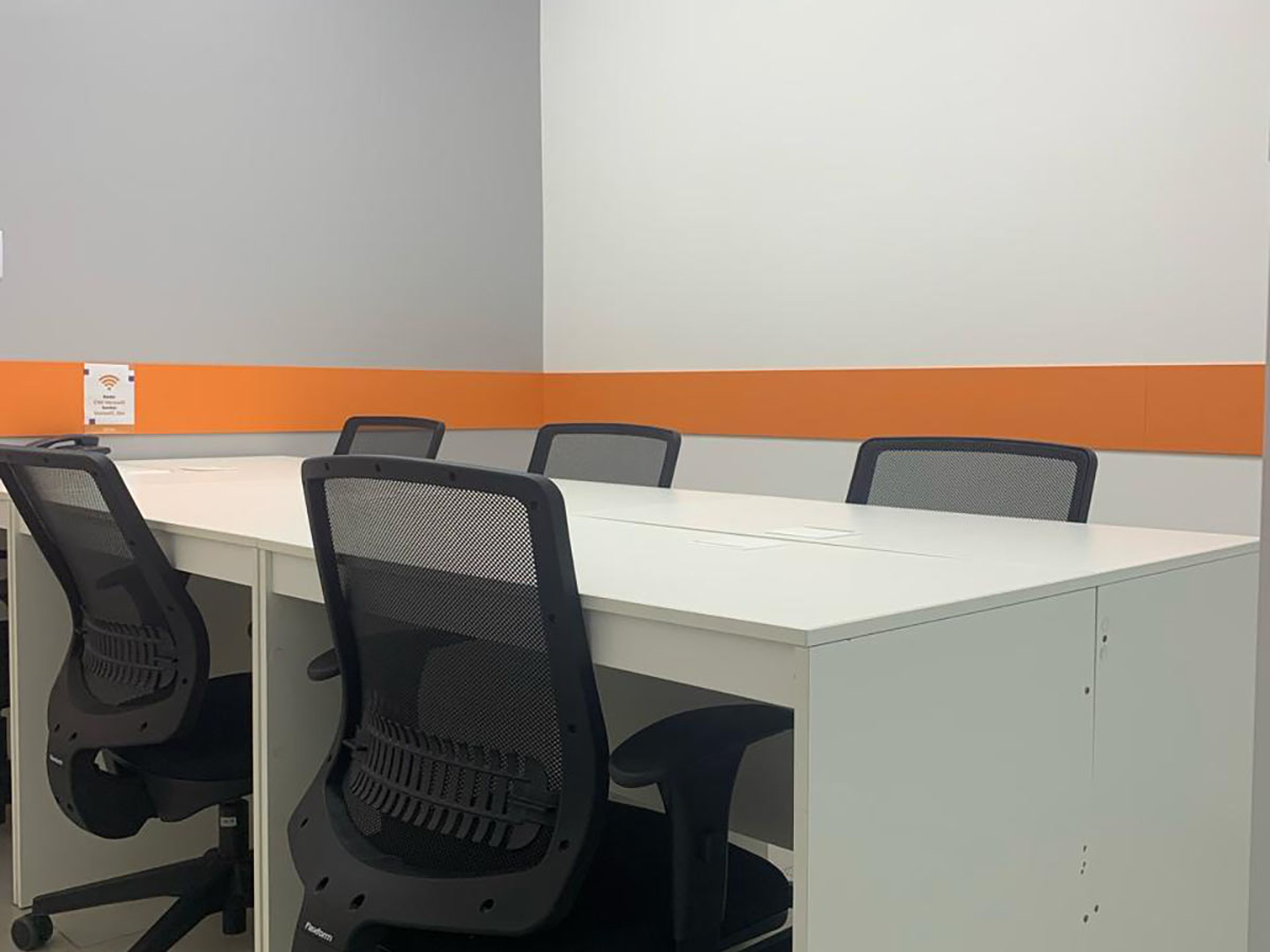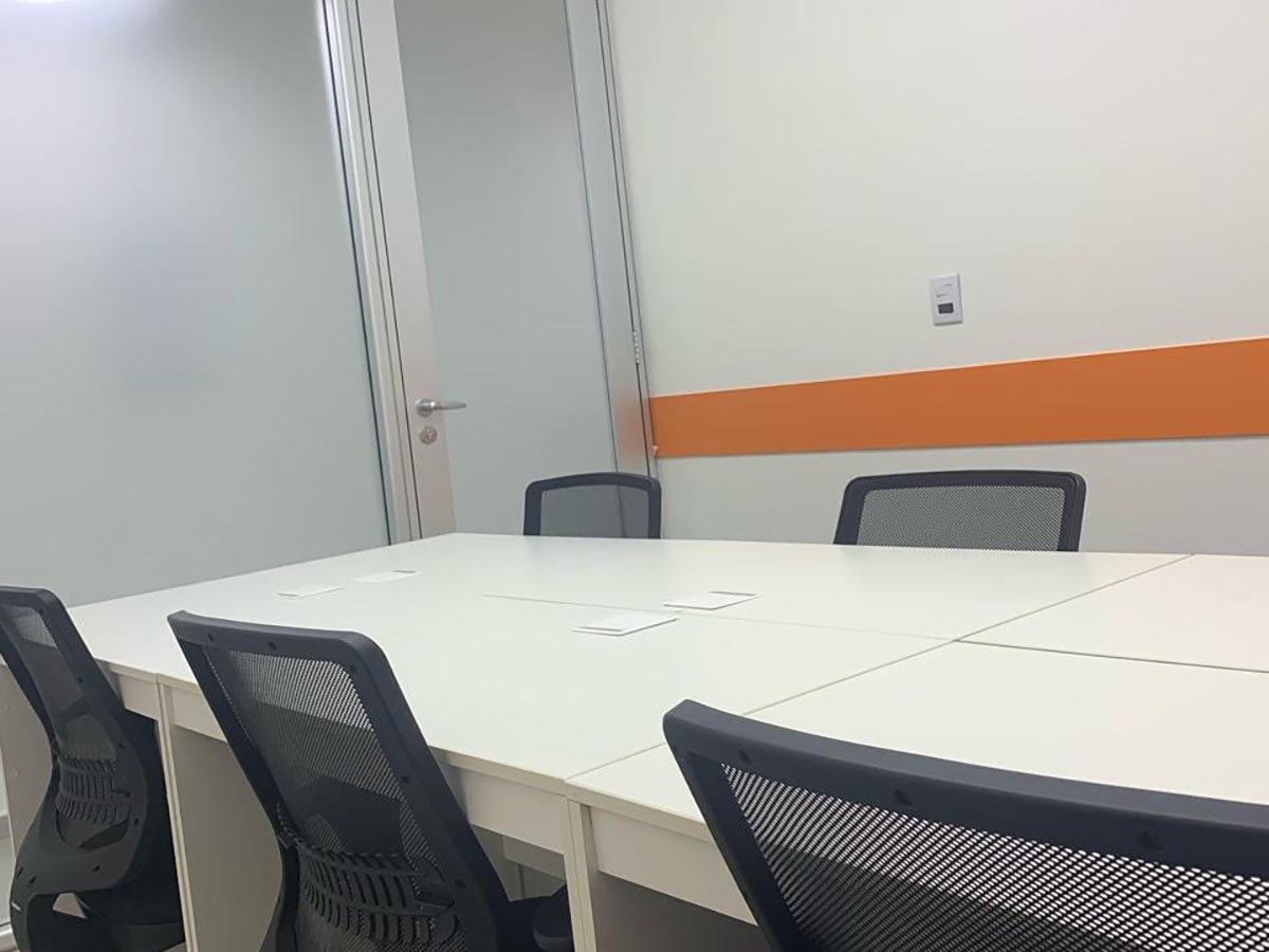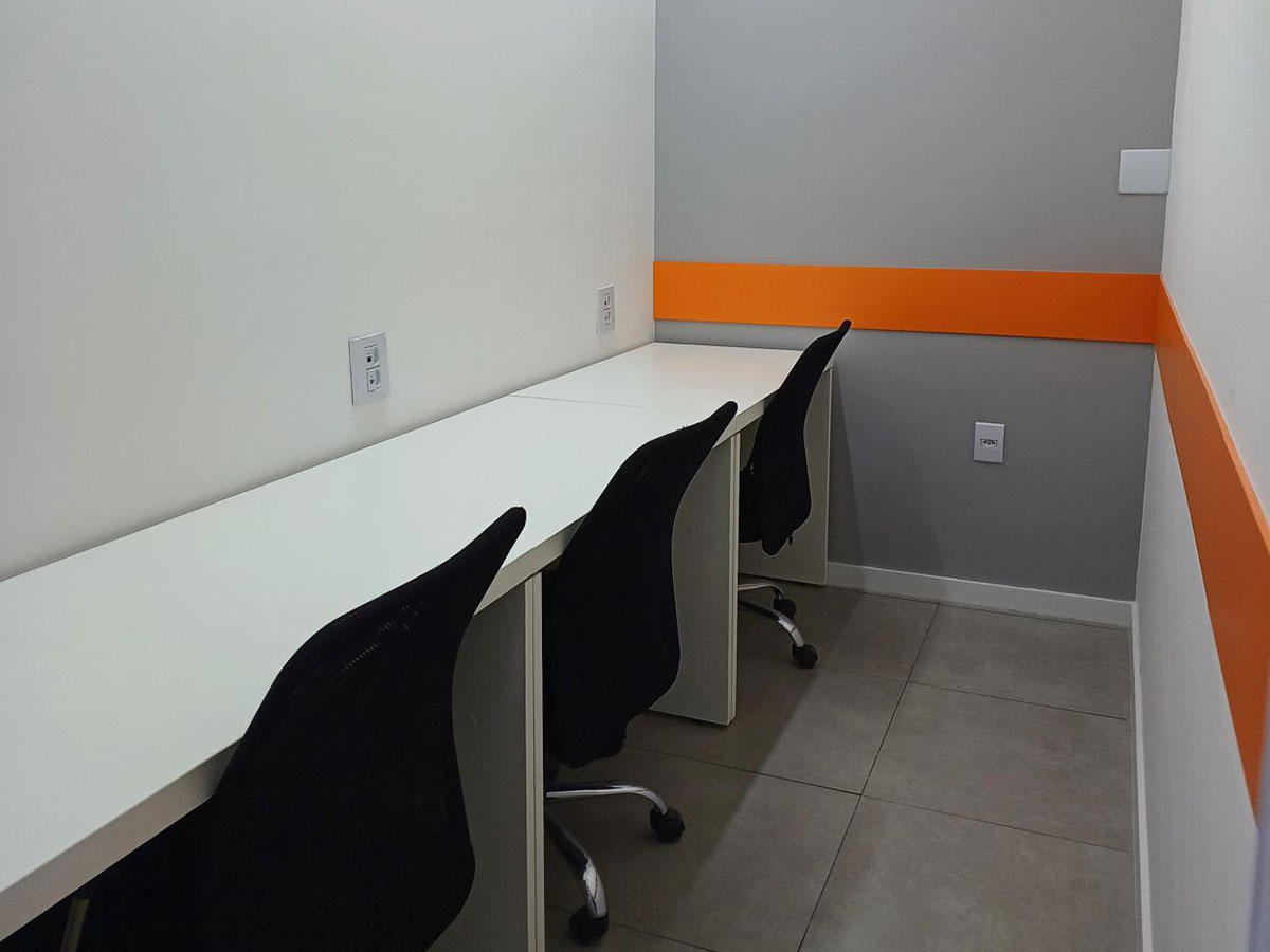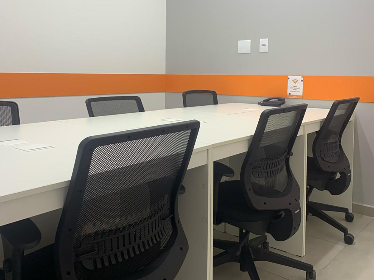 Banheiro exclusivo, internet wi-fi e cabeada redundante, mesas, cadeiras, estante de apoio e lousa de vidro